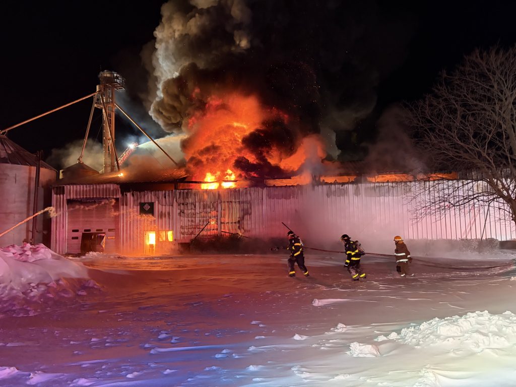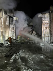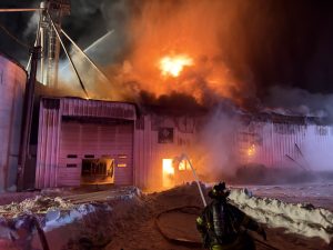 On Sunday night just before halftime of the Super Bowl, York firefighters with mutual assistance from Caledonia for a Ladder and East Avon as the FAST were alerted to a farm on Stewart Rd. for a commercial building fire. The first arriving York Chief declared a working fire and requested a 2nd Alarm, bringing in many additional resources from the area.